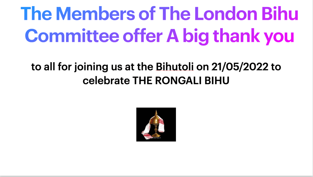 A big thank you from The London Bihu Committee A big inspiration to us the members of The London Bihu Committee, that so many new faces joined us at the Bihutoli along with our familiar faces Like Loading...